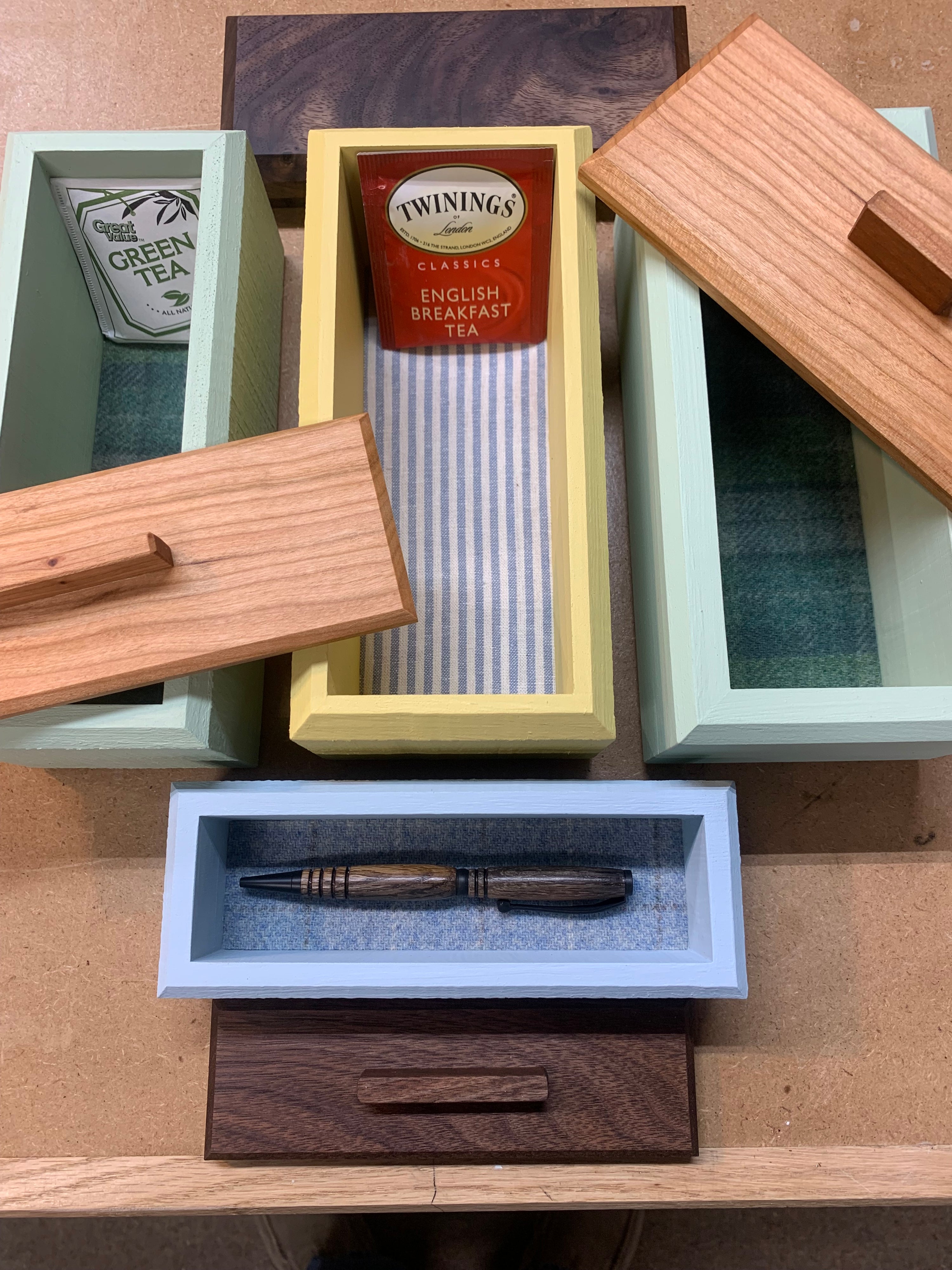 A collection of boxes ranging from little pen boxes to keepsake boxes....